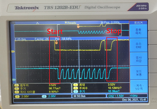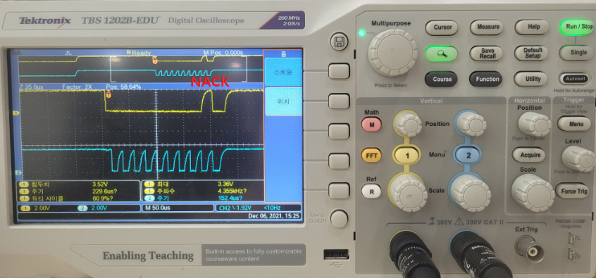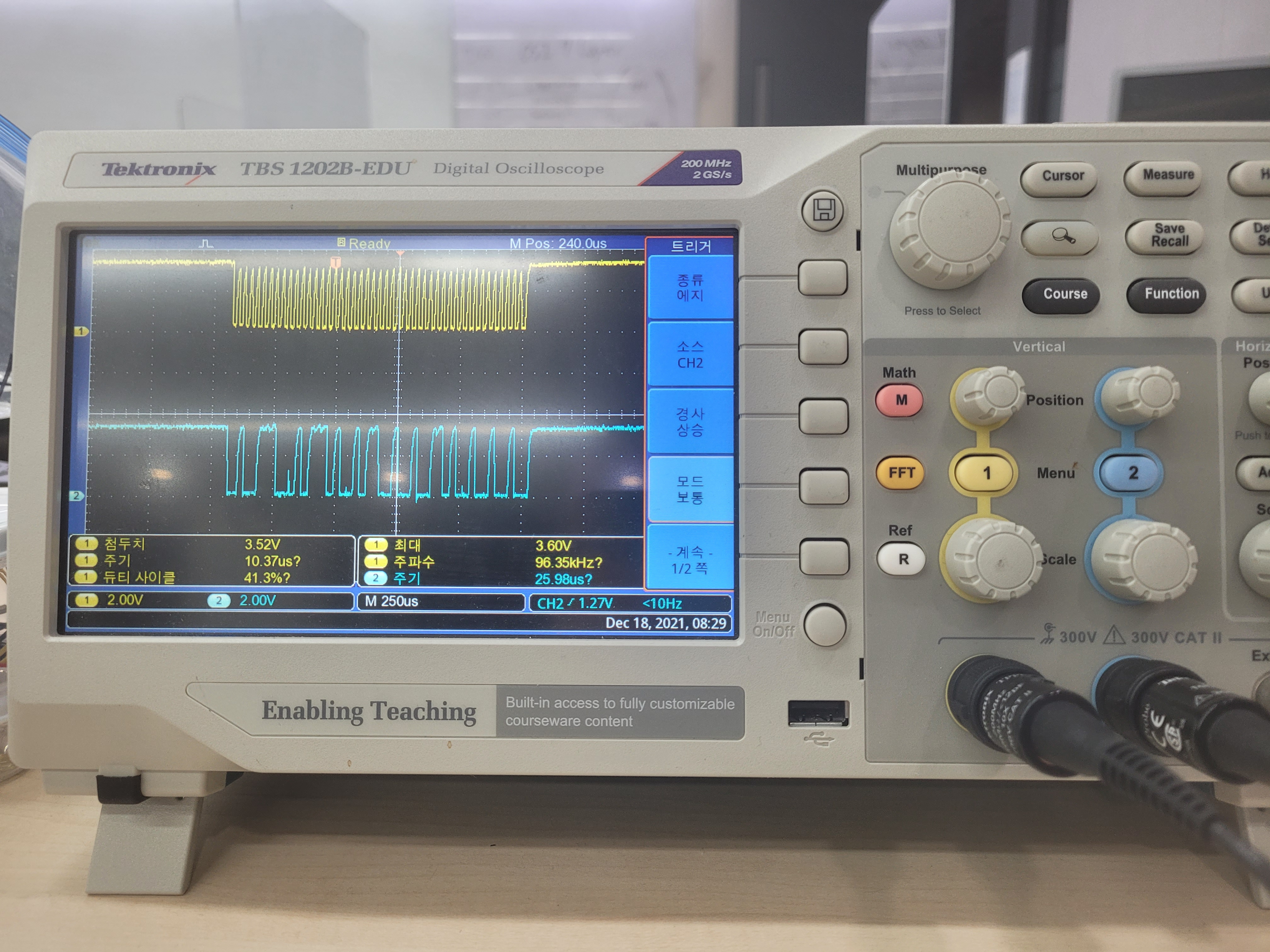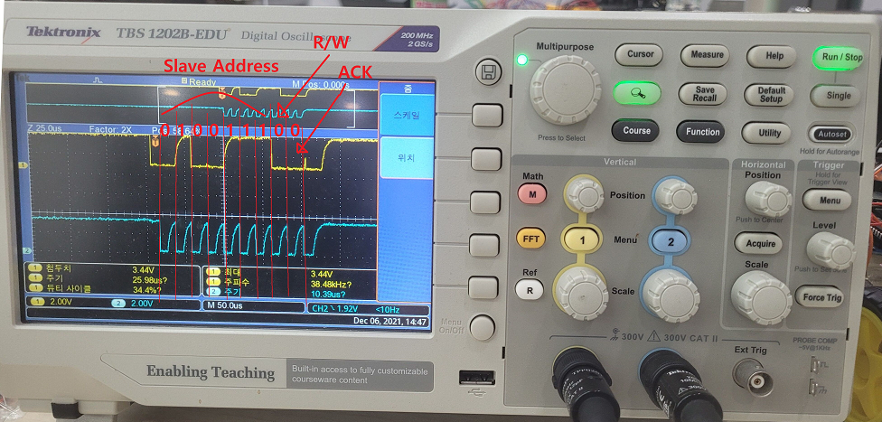 Trigger 메뉴를 누르고 종류는 에지, I2C는 디폴트 HIGH상태이다가 통신이 시작하면 LOW로 떨어지니까 경사는 하강 선택, 소스는 CH1/CH2 각각 선택한 뒤 Trigger Level을 돌려 적당하게 맞춰준다. 트리거 모드는 보통으로 선택한다. 자동으로 하면 트리거를 잡고 멈추는게 아니라 계속 돌아가서 다시 잡으니까 눈으로 확인하기 어렵다.