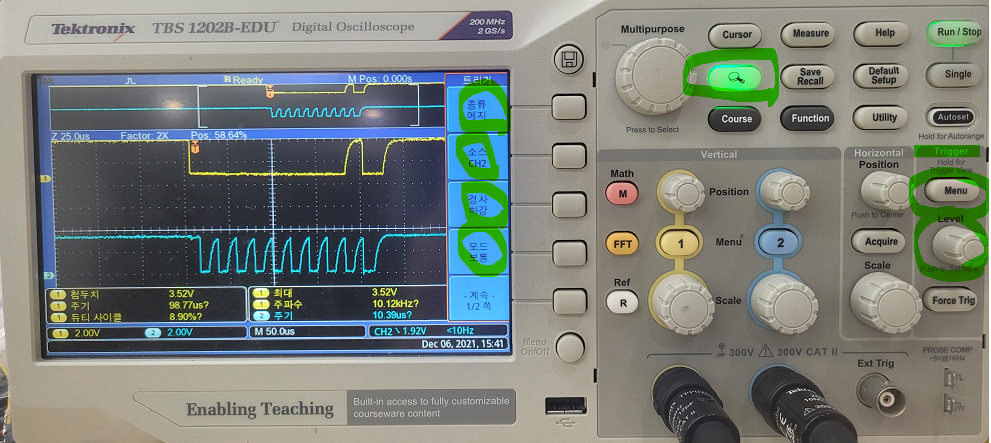 먼저 Verticla과 Horizontal의 Scale을 조절해서 전압레벨과 시간 단위를 적당하게 맞춰준다.