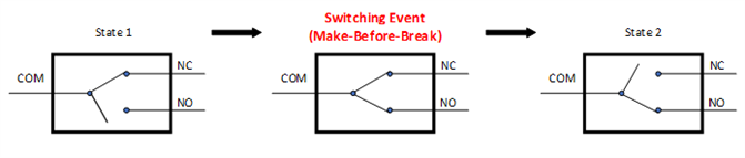 반면 Make Before Break는 신호 경로가 변경될 때 전기적 연결이 끊어지지 않도록 보장하는 동작이다. 이렇게 하면 스위치 전환 동작 중 하이 임피던스 출력(Open, 저항이 무한대)이 존재하는 걸 방지할 수 있다.