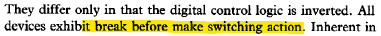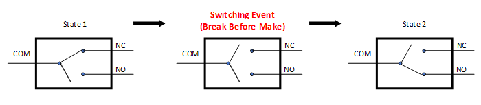 먼저 Break Before Make 는 신호의 경로가 변경될 때 전기적으로 연결이 잠시 끊어지는 것을 의미한다. 이렇게 하면 두개의 경로 사이의 격리를 보장하고 신호 왜곡을 방지한다. 대부분의 스위치는 Break Before Make가 쓰일거다.