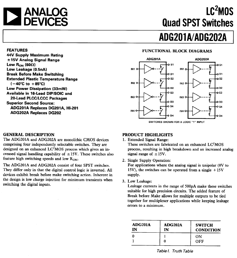 ADG201A는 Analog Devices 사에서 나온 LC2MOS Quad SPST Switches이다.