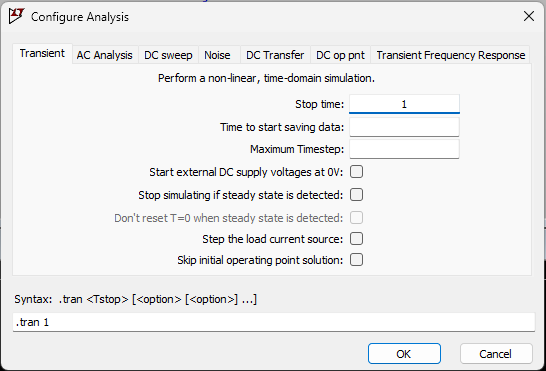 그 중 Transient는 과도 해석이라고도 하는데 시간 영역에서 해석을 하는 것이다. 0초부터 1초까지 측정하는 것으로 하고 OK를 누른 뒤 나타나는 시뮬레이션 텍스트는 화면 아무곳에나 위치시킨다.