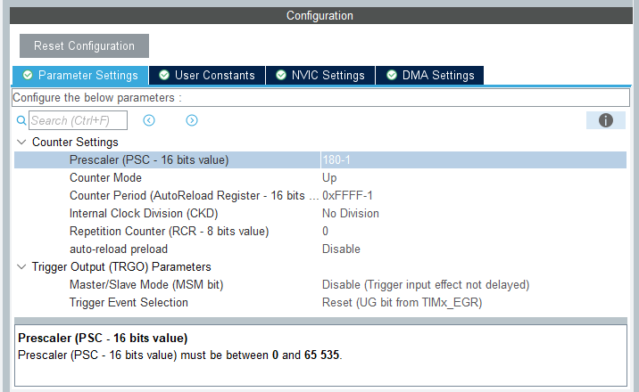 Prescaler 값은 180-1로 해서 1MHz(주기 1us) 클락을 얻고 Counter Period는 최대값으로 설정한다.