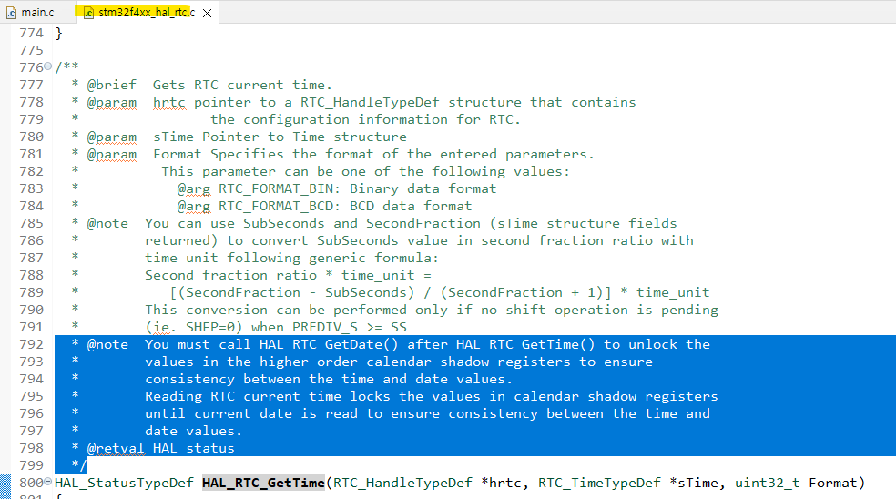 HAL_RTC_GetTime 함수를 따라 들어가보면 다음과 같은 주의사항이 나온다.