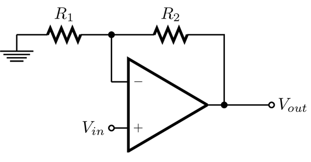 - 구성 : 신호는 연산 증폭기의 비반전 입력(+)에 연결한다. 피드백 저항을 사용해 연산 증폭기의 출력이 반전 입력(-)으로 피드백 되고, 피드백 저항과 직렬로 연결된 또 다른 저항을 통해 GND 또는 DC 오프셋에 연결된다.