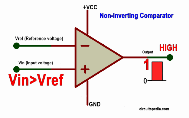 - 비반전 입력(+)이 반전 입력(-)보다 크면 출력은 비교기의 높은 전원으로 포화되고, 반대로 반전 입력(-)이 비반전 입력(+)보다 크면 출력은 비교기의 낮은 전원으로 포화된다.