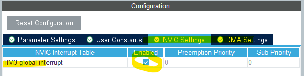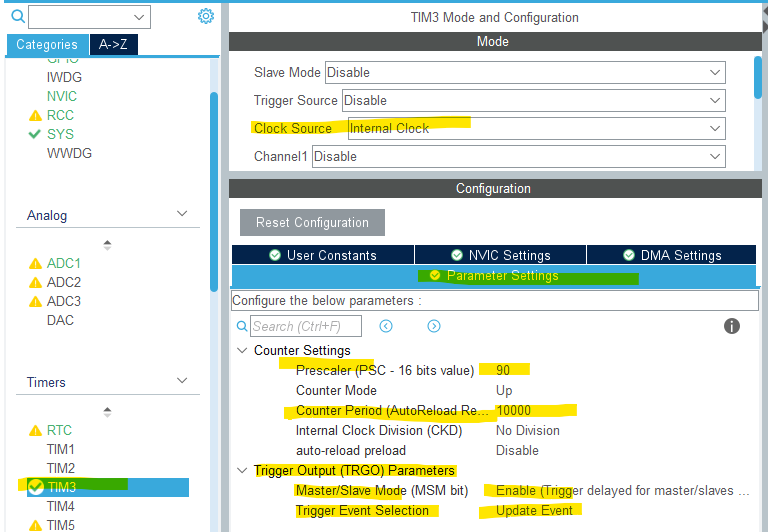 타이머3에 공급되는 Clock source 는 90MHz이고 Prescaler 와 ARR(Period)는 위와같이 설정하여 100Hz(0.01초) 마다 인터럽트가 발생하도록 한다.