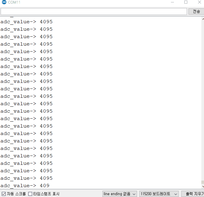시리얼 모니터를 켜고 보드레이트를 맞춘다.