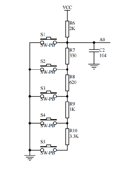 아무 버튼도 안눌렀을 때 5V이고 S1을 누르면 0V이다. 직렬회로에서 합성저항의 값을 구하는건 그냥 더하면 되고 나머지는 전압분배법칙에 의해 알아낼 수 있다.