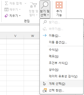 홈 > 편집 > 찾기 및 선택 > 개체 선택을 누르면 이제 부터 드래그 앤 드롭 시 그림, 도형, 텍스트 박스와 같은 개체만 선택이 된다.