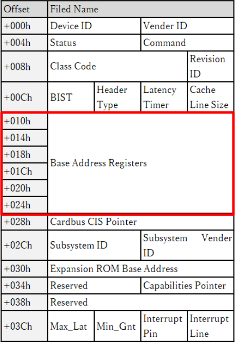 시스템 메모리 영역을 매핑하는데 사용되는 레지스터로 configuration space의 offset 0x10부터 시작하여 6개의 BAR가 위치한다.