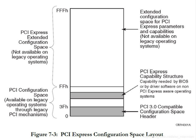 PCI 레거시 장치는 256바이트 크기의 Configuration space를 가진다. 한편 PCIe장치 Configuration space는 4096바이트의 확장된 크기를 가지는데 앞부분 256 바이트는 PCI Configuration space와 동일한 구조로 하위호환성을 제공한다.