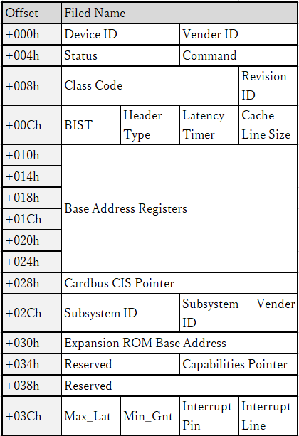 그리고 PCI와 PCIe 모두 Configuration space의 첫 64바이트는 장치의 기본 정보를 제공하는 공통 헤더로 구성된다.