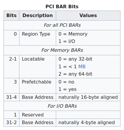 - Memory BAR의 기본 주소를 나타내며 이 주소는 16바이트 단위로 정렬된다. 즉, 0x10 단위로 주소가 설정될 수 있고 하위 4비트가 0으로 고정된다.