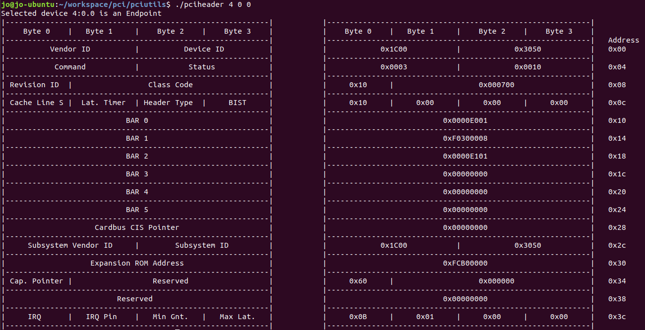 다음은 04:00.0 장치의 PCI 헤더를 출력한 것이다.