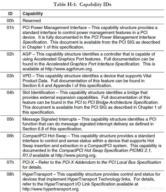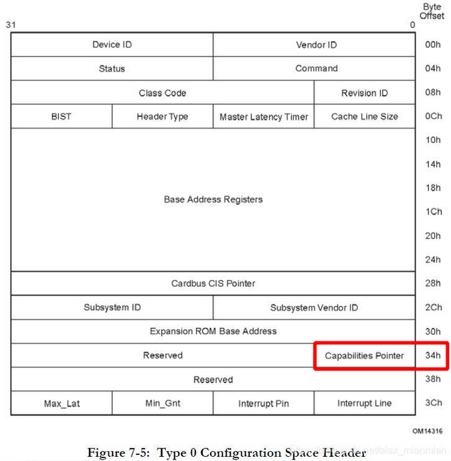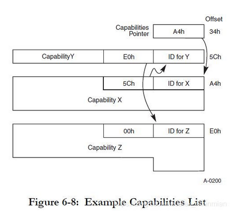 먼저 PCI Capabilities는 0x34 Capabilities Pointer가 가리키는 위치에서 부터 시작하는데 각 Capability는 링크드 리스트 형태로 저장되며 1바이트의 Capability ID 다음에 등장하는 포인터가 다음 Capability를 가리키는 구조이다.