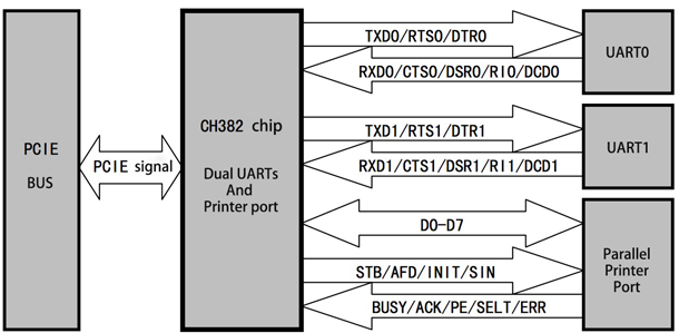 CH382라는 칩셋 자체는 PCIe 기반 듀얼 채널 UART와 양방향 페러럴포트(프린터 모드)를 동시에 지원하는 다목적 칩셋이다. 하지만 SW562라는 PCIe 카드는 CH382의 기능 중 페러럴 포트만 사용하게끔 설계가 되어있고 DB25 핀아웃도 해당 페러럴 포트 신호만 나와있으므로 이 카드를 가지고 UART 기능을 사용할 수는 없고 한 채널의 페러럴 포트만 사용할 수 있다.