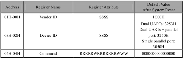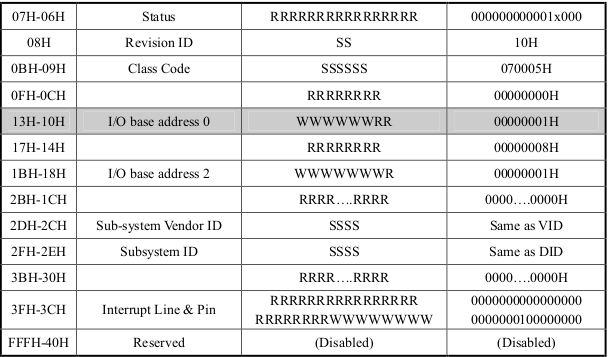 데이터 시트를 보면 BAR0, BAR1, BAR2 만 사용되고, 그 중에서도 Serial Port 제어에 사용되는 I/O base address 0 는 I/O space로 256 btyes 사이즈의 공간을 사용하고, Parallel Port 제어에 사용되는 I/O base address 2 는 I/O space로 4 btyes 사이즈의 공간을 사용하는 것을 알 수 있다.