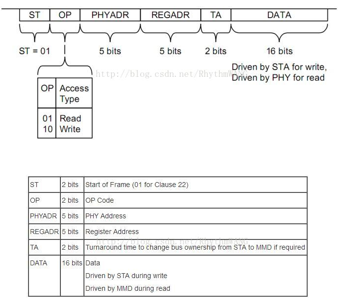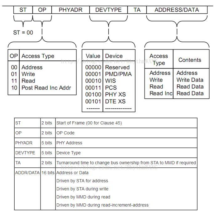 Clause 45는 Clause 22의 확장 버전으로 고속 네트워크 PHY를 지원하도록 설계되었으며 프레임 포맷은 다음과 같다.