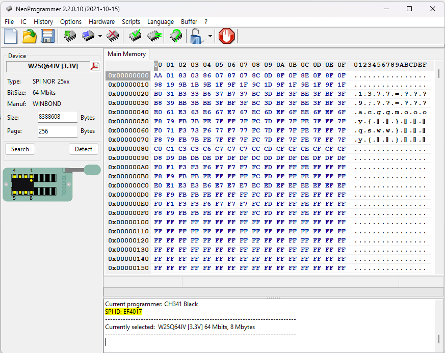 - Detect IC : 칩 ID를 읽어 연결된 칩의 모델을 자동으로 감지한다. IC > Search 메뉴에서 특정 모델 칩을 수동으로 검색하고 선택할 수 도 있다.