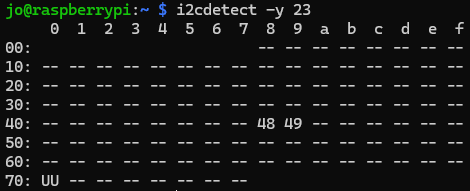 또한 TCA9548A의 SD1, SC1에 0x48, 0x49 주소를 갖는 다른 I2C 장치를 연결하고 i2c-tools를 사용해 i2c-23 버스를 스캔해 보았을 때 장치가 올바르게 인식되는 것을 확인하였다.