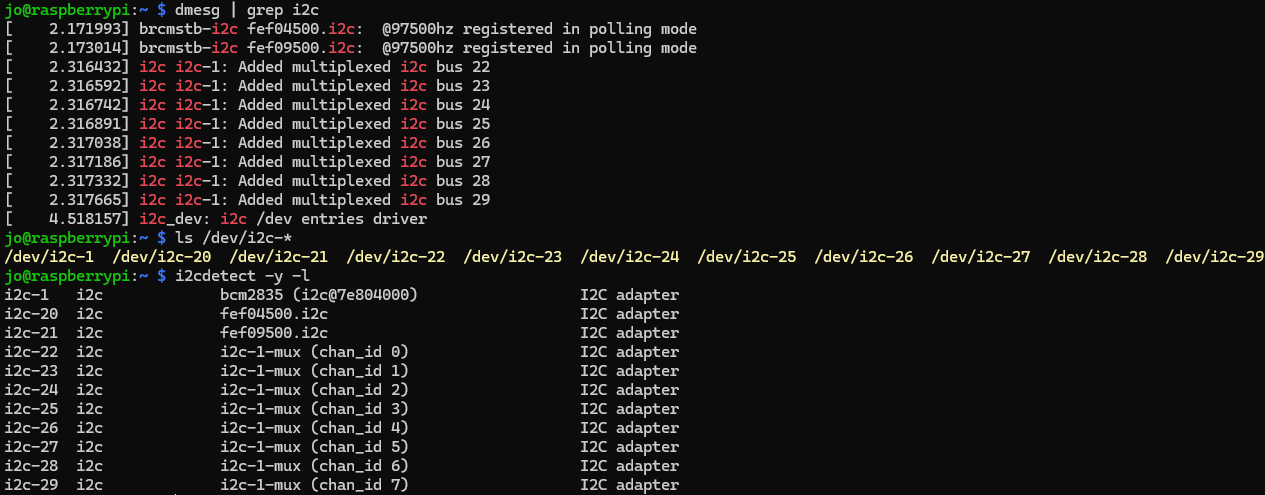 dmesg를 통해 드라이버가 올바르게 로드되었는지 확인하고, 추가적인 i2c 버스가 생성되었는지 확인한다.