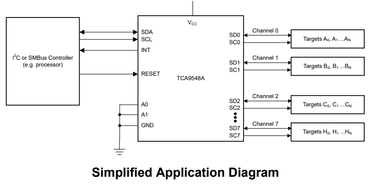 - 3개의 주소 핀으로 한 I2C 버스에 최대 8개의 TCA9548A 칩 연결 가능