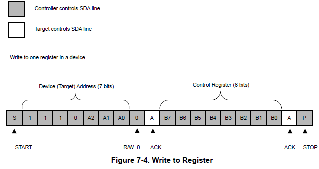 I2C 패킷은 START 비트로 시작하여 8비트 데이터 바이트와 1비트 ACK/NACK 조합이 순차적으로 전송되고, STOP 비트로 종료되는 일반적인 구조를 가진다. 첫 바이트는 7비트 Slave 주소와 R/W 비트로 구성되며, 그 다음 바이트는 Control Register에 기록할 값이다.