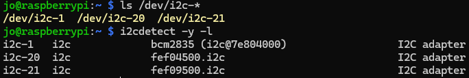 i2c-20 및 i2c-21 버스는 HDMI 포트의 Display Data Channel (DDC) 을 위한 I2C 인터페이스이며, i2c-1버스에 연결된 I2C MUX 디바이스의 버스 번호는 커널에 의해 그 이후 값인 i2c-22부터 i2c-29까지 할당된 것을 확인할 수 있다.