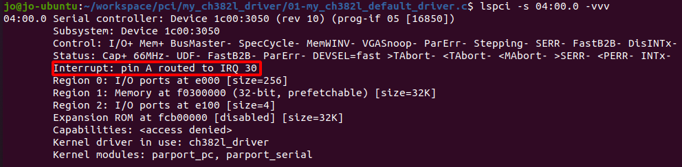 먼저 lspci 명령을 사용해 PCIe 카드 정보를 확인한 결과, 해당 장치는 IRQ 30번을 사용하며 인터럽트를 지원하는 것으로 나타난다. 참고로, 여기서 IRQ number는 시스템이 주변 장치의 인터럽트를 관리하기 위해 매핑한 숫자일 뿐, 실제 CPU와의 물리적 라인과는 관련이 없다.