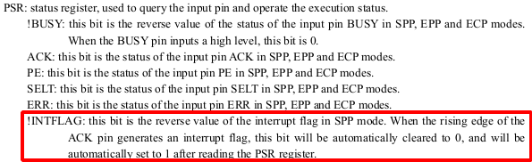 다음으로 PSR 레지스터에서도 인터럽트 상태를 확인할 수 있다. !INTFLAG 비트 설명을 보면 ACK 입력 핀에서 라이징 엣지가 발생 시 인터럽트 플래그가 생성되고, 해당 비트는 0으로 설정되며, 이후 PSR 레지스터를 읽으면 1로 설정된다.