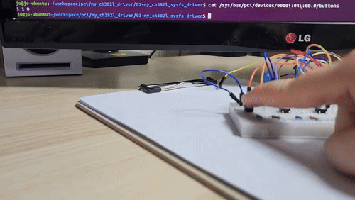 이번 글에서는 PCI 디바이스의 sysfs 인터페이스에 leds와 buttons라는 속성을 추가하여, 사용자가 아래와 같은 명령어를 통해 3개의 LED 출력을 제어하고, 3개의 버튼 상태를 조회할 수 있는 인터페이스를 구현하는 것을 목표로 한다.