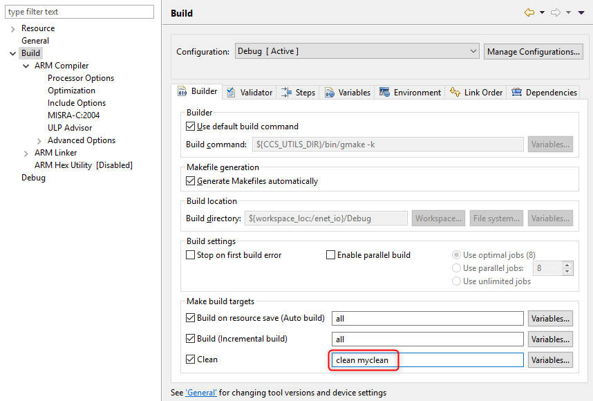 Rebuild Project 또는 Clean Project 선택시 gmake clean 명령을 사용하여 활성 빌드 구성 폴더의 .obj, .pp, .out 파일을 삭제하고, makefile 및 .map 파일은 삭제되지 않는다.